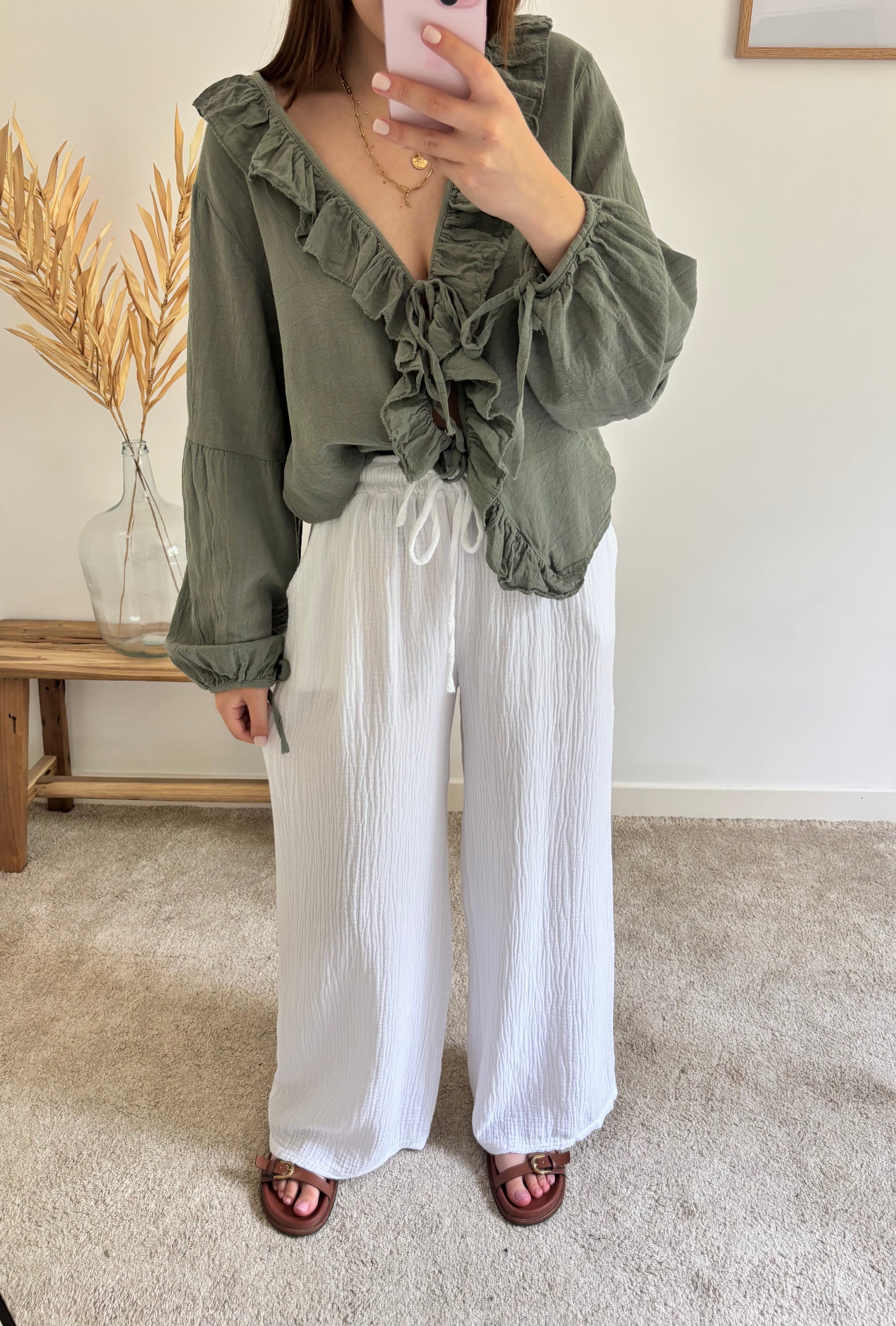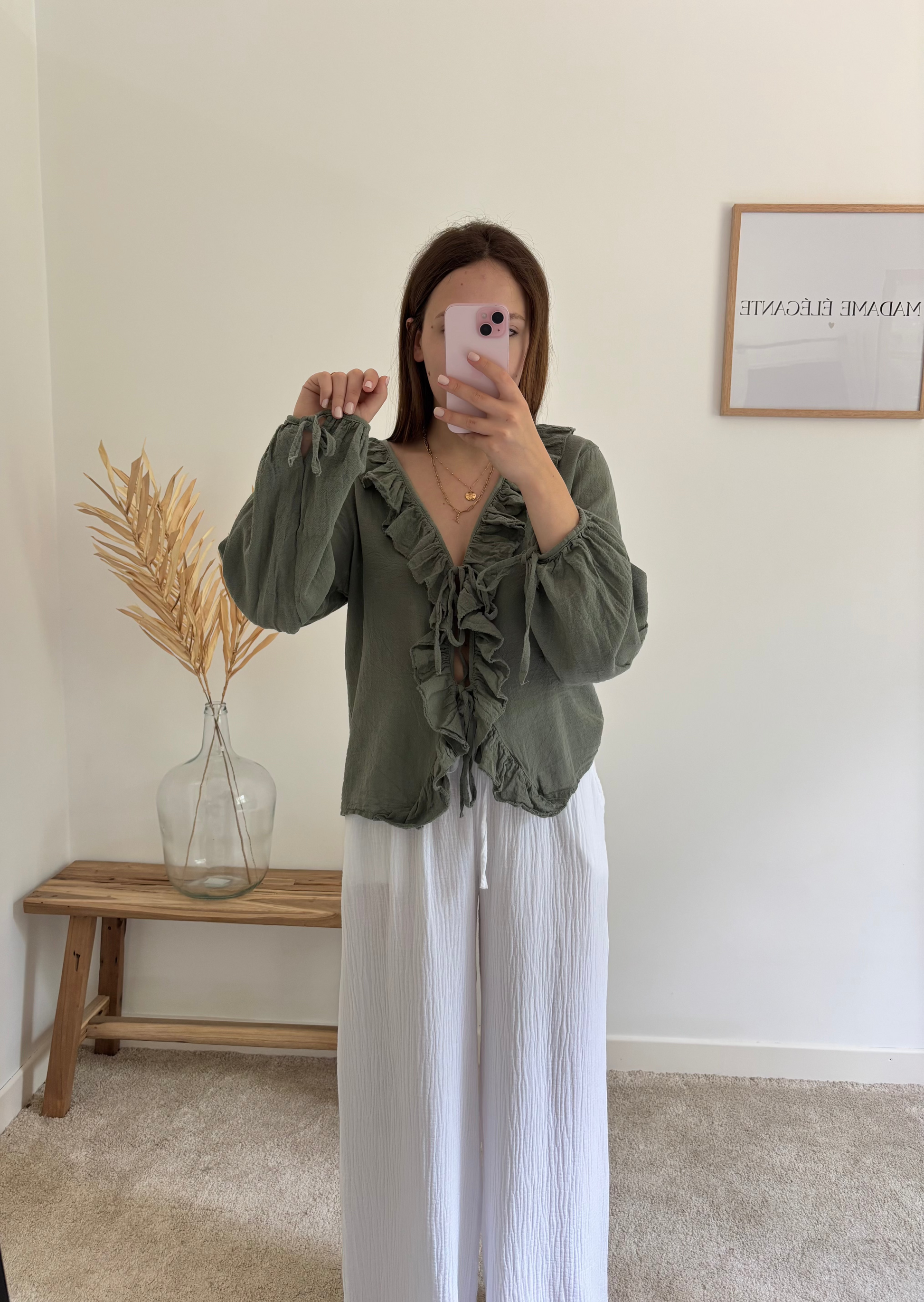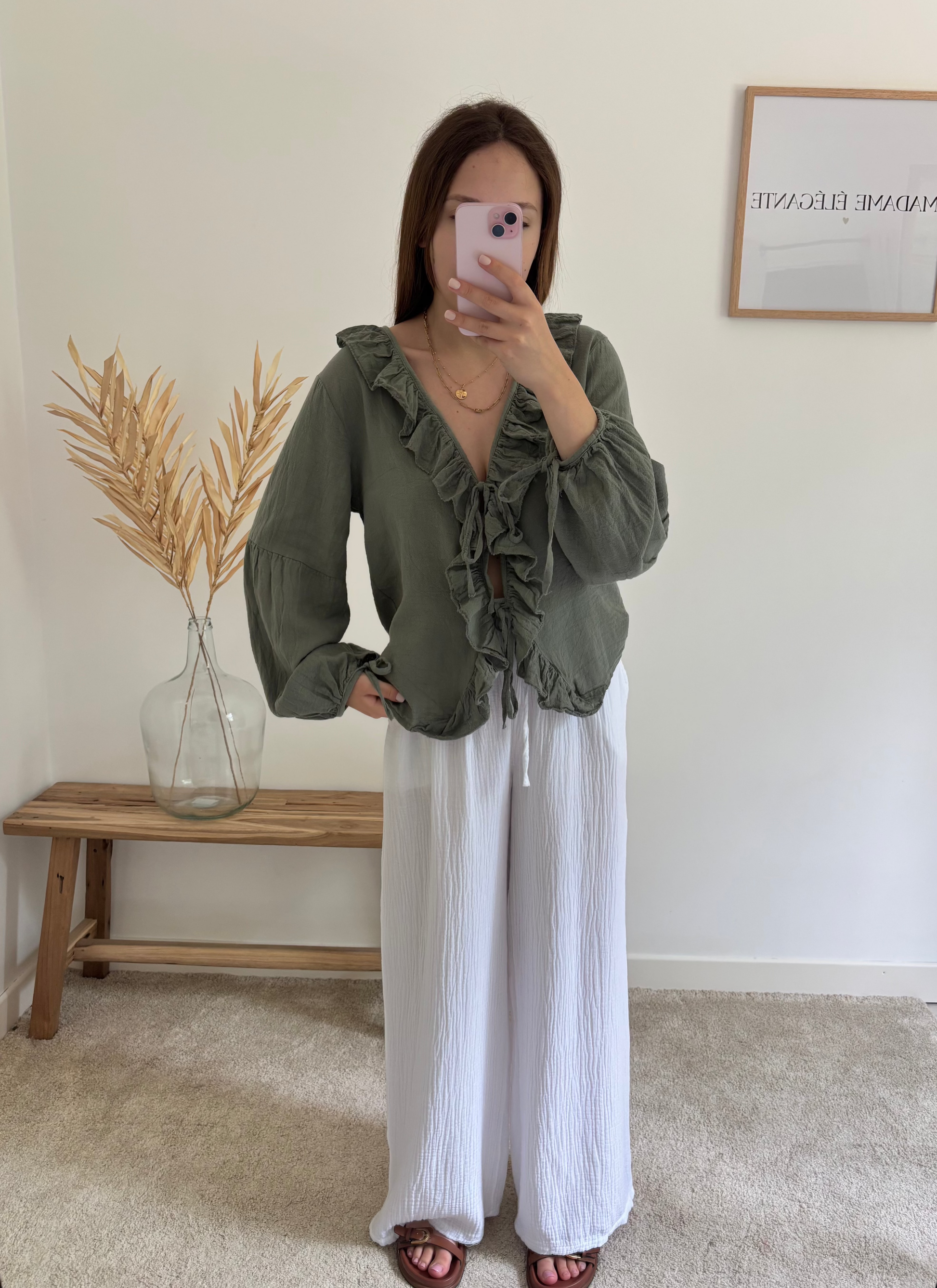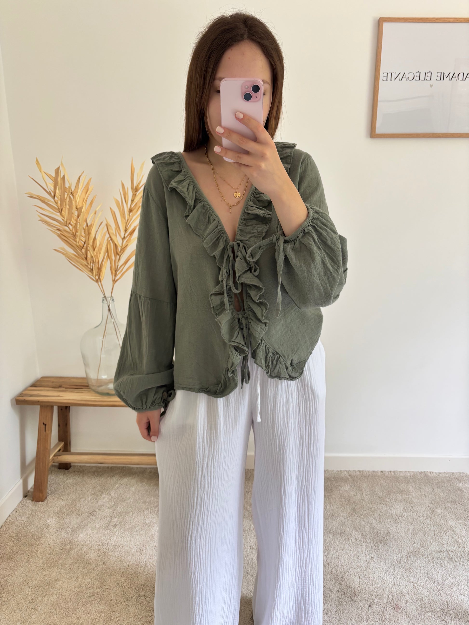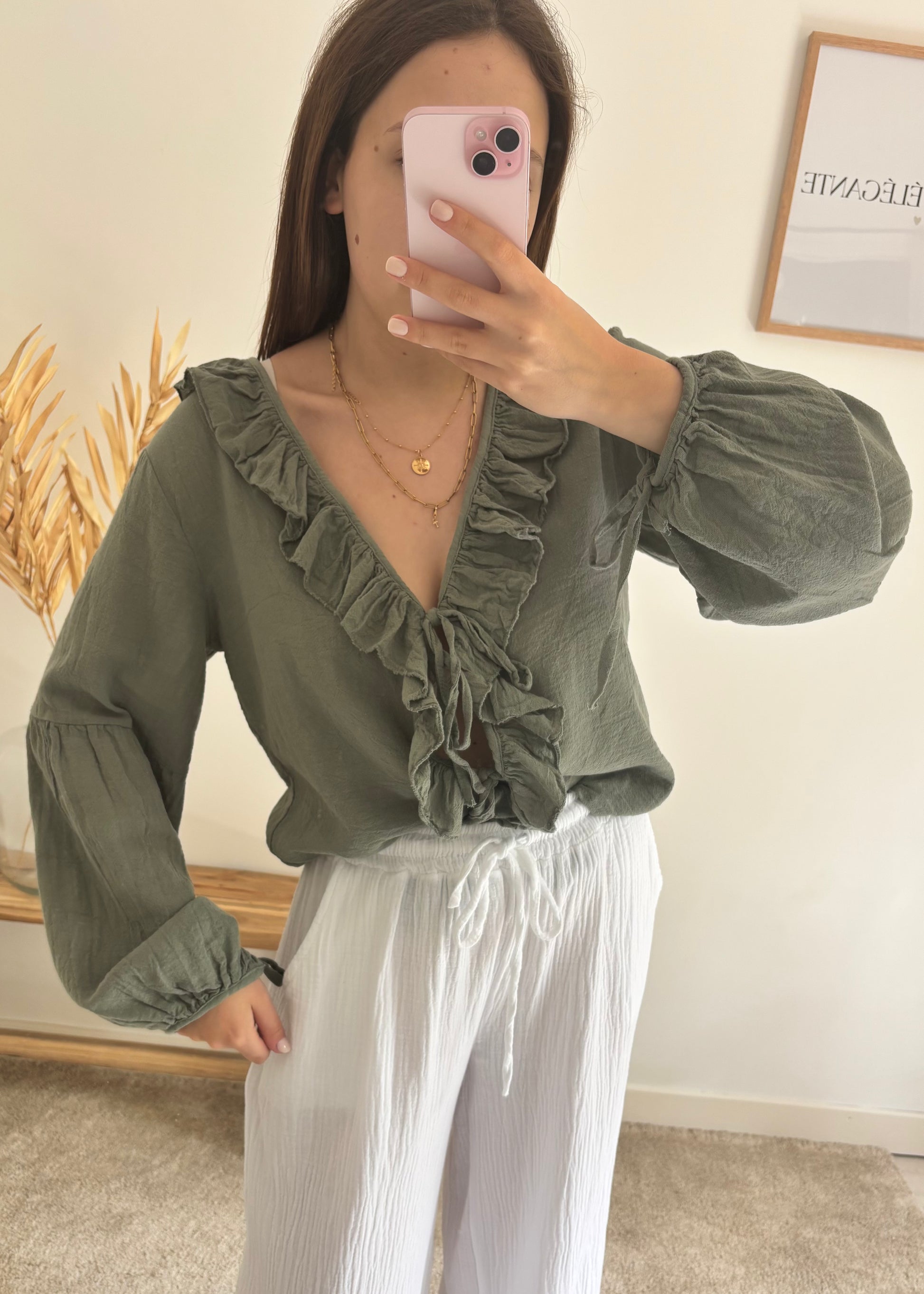 Laissez-vous séduire par le charme de cette blouse à volants, à la fois féminine et légère. Avec ses détails délicats et son tombé fluide, elle apporte une touche romantique à vos tenues, sans en faire trop. Parfaite pour celles qui aiment les pièces simples